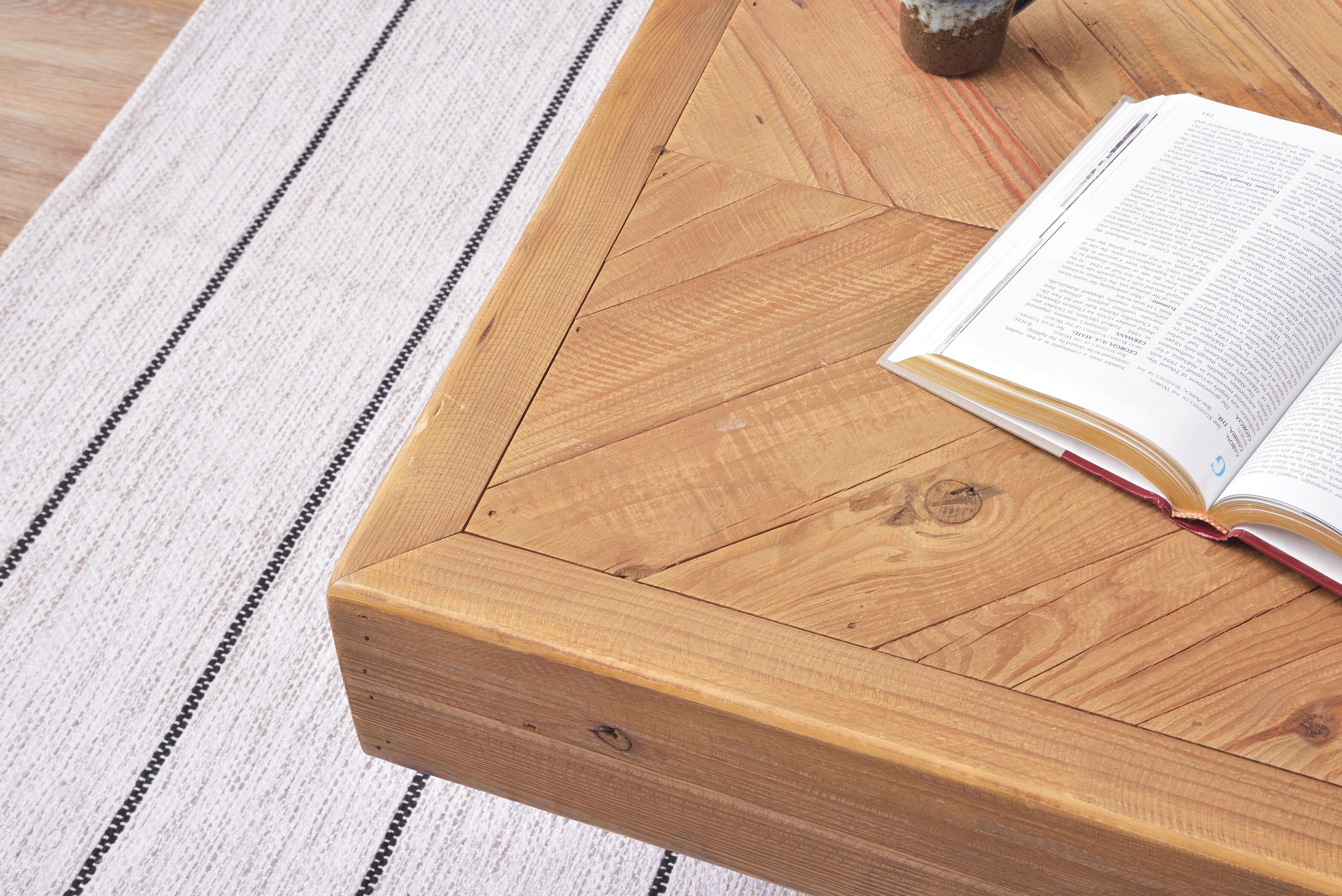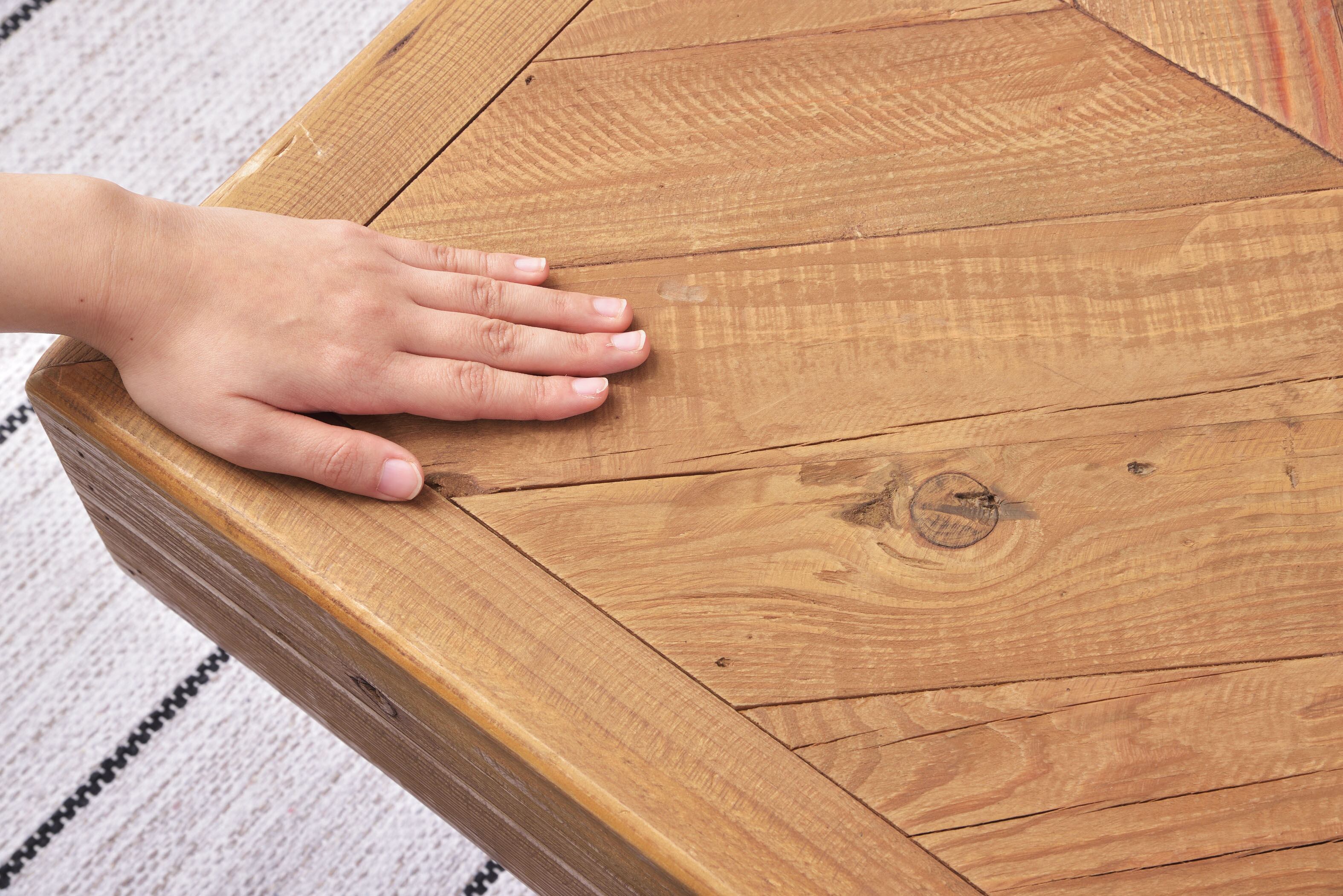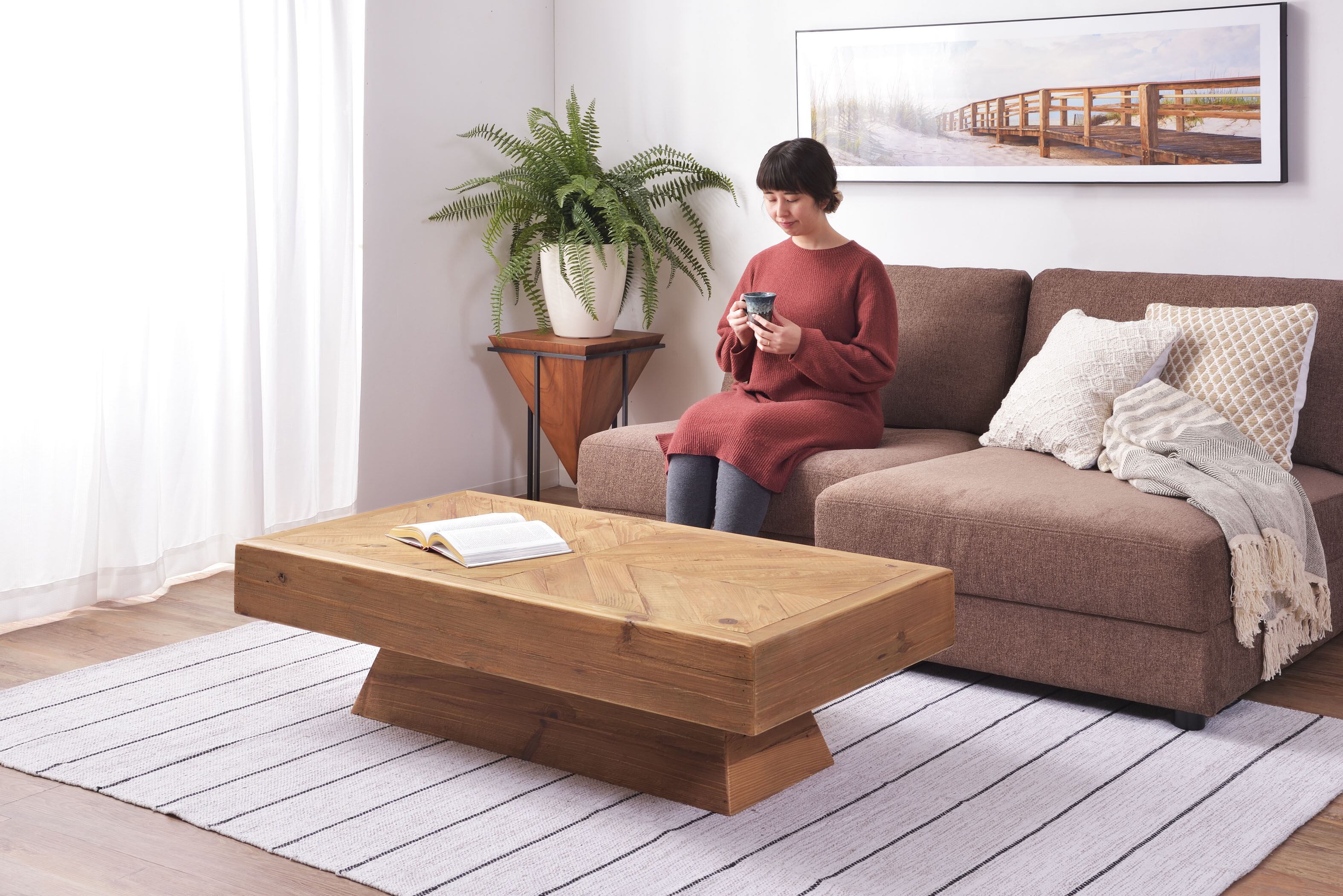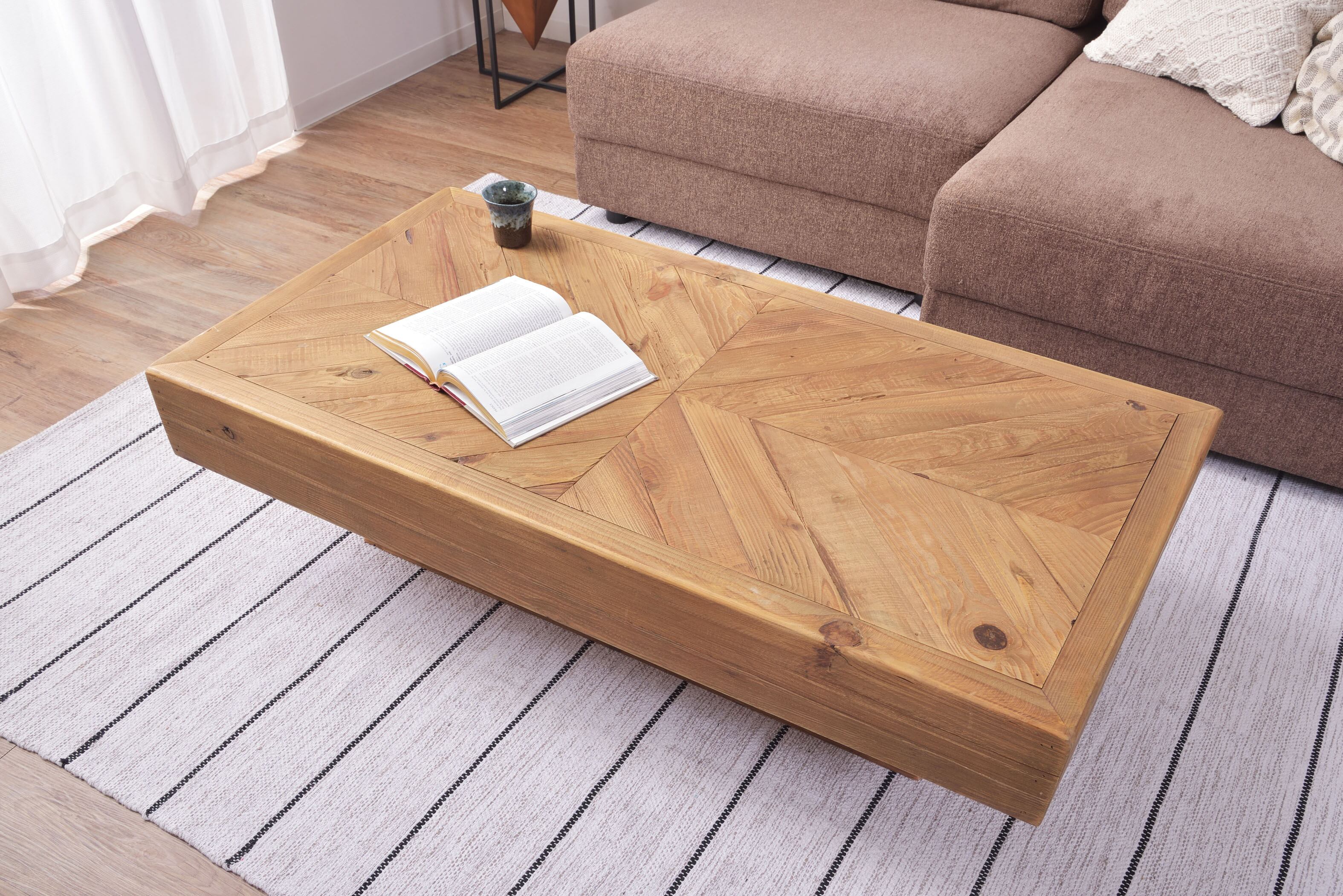天然木のパイン古材をつかった、木目や節目がかっこいいリビングテーブル。どこからでも使いやすいデザインは家族が集まるリビングにぴったりのデザインです。