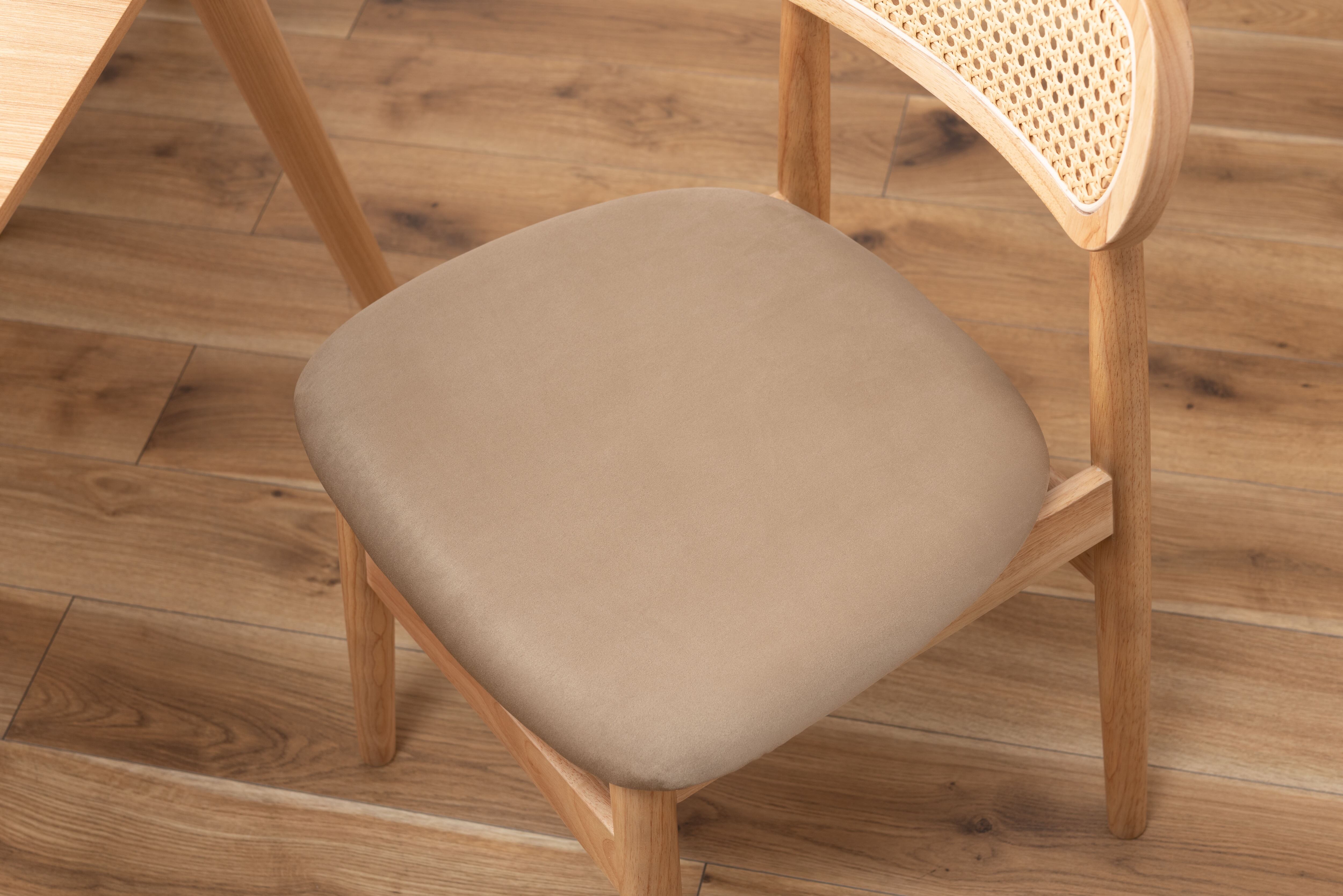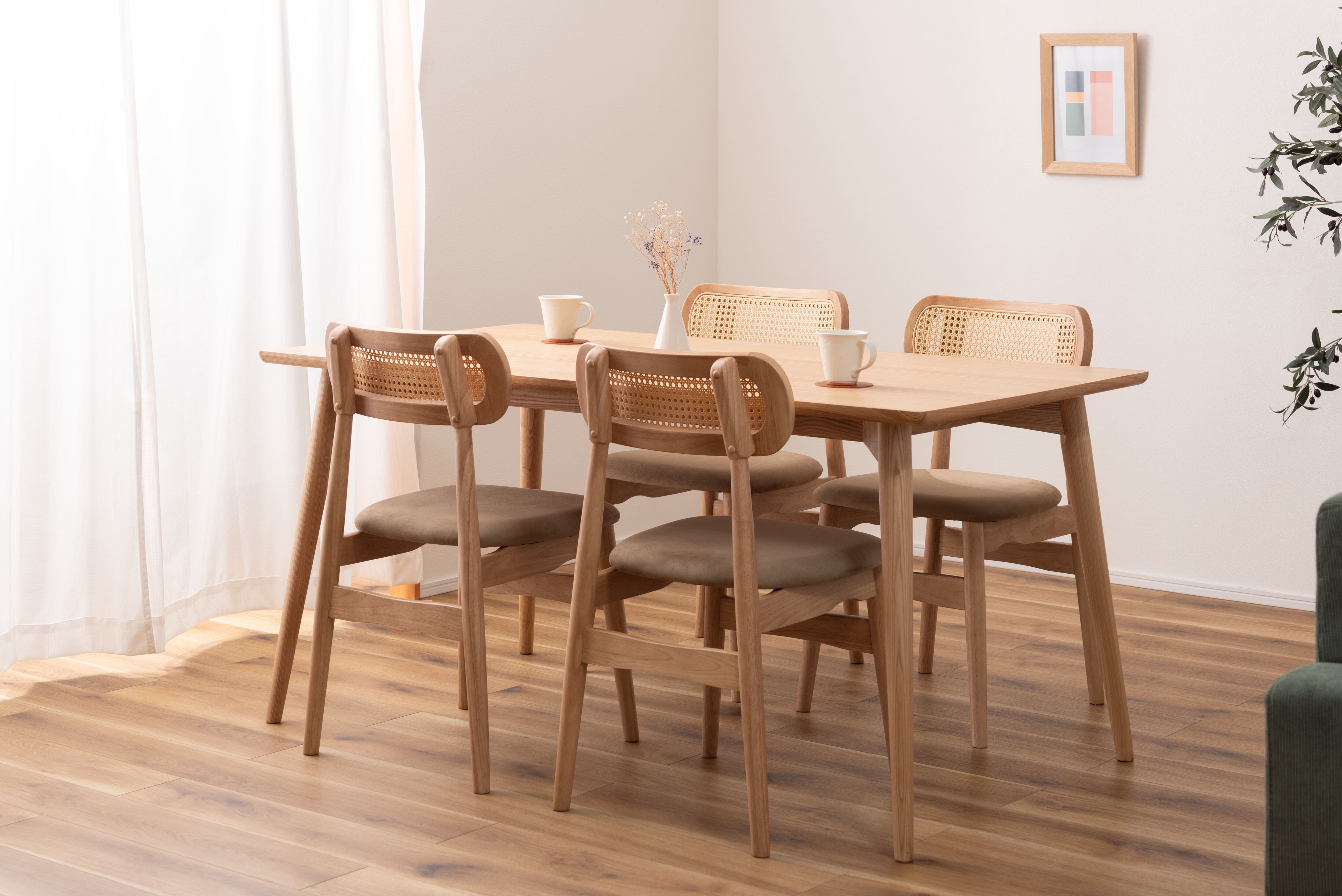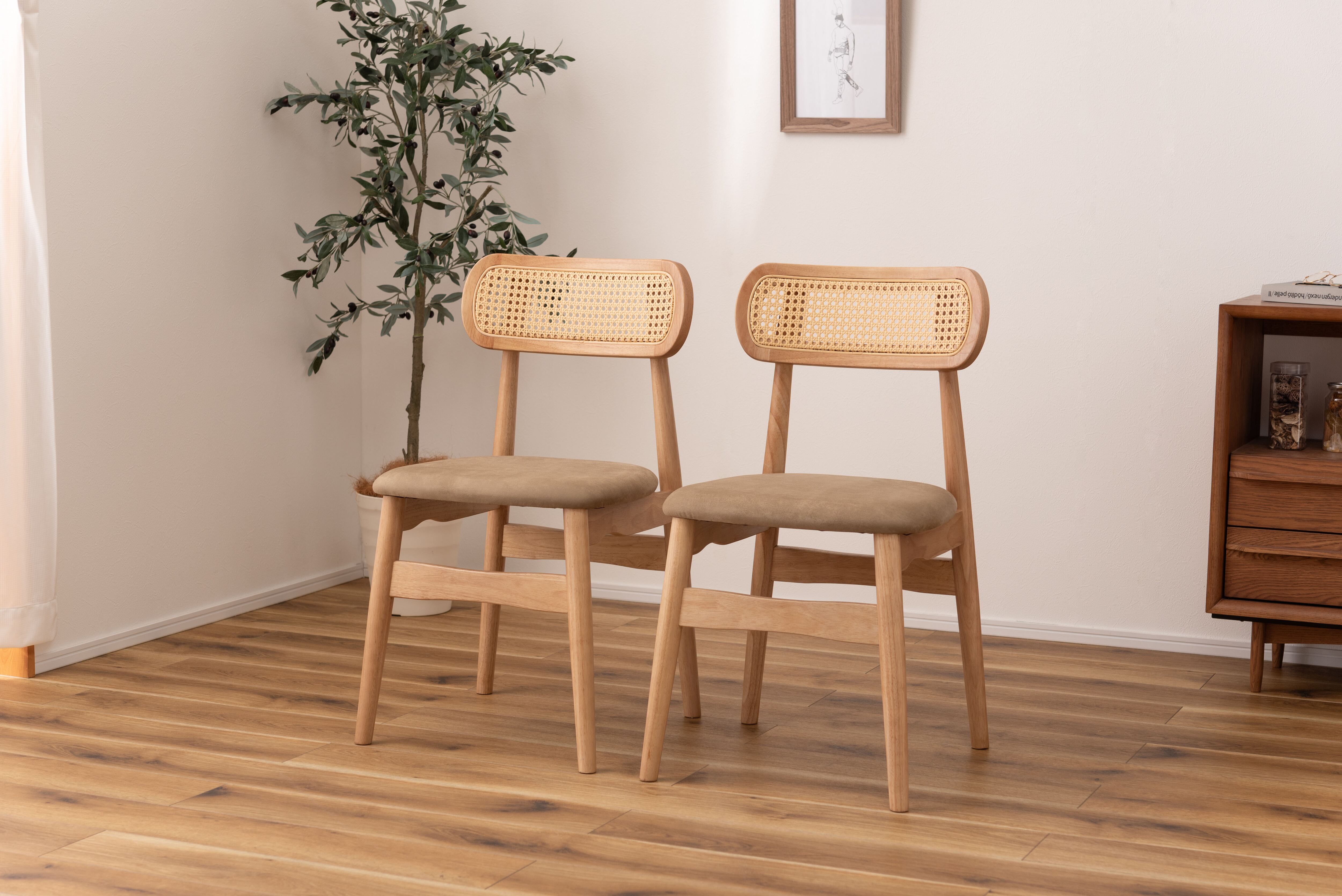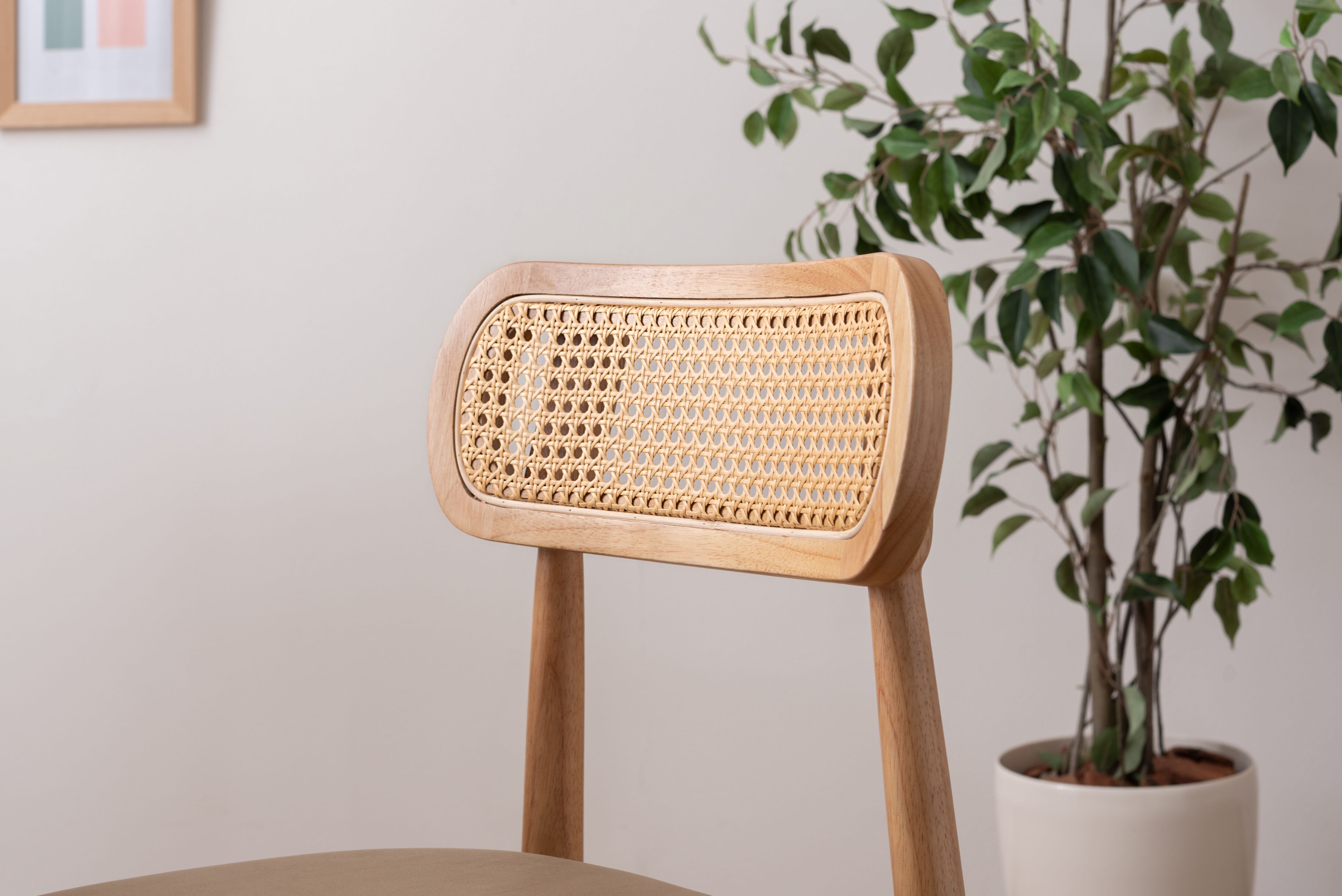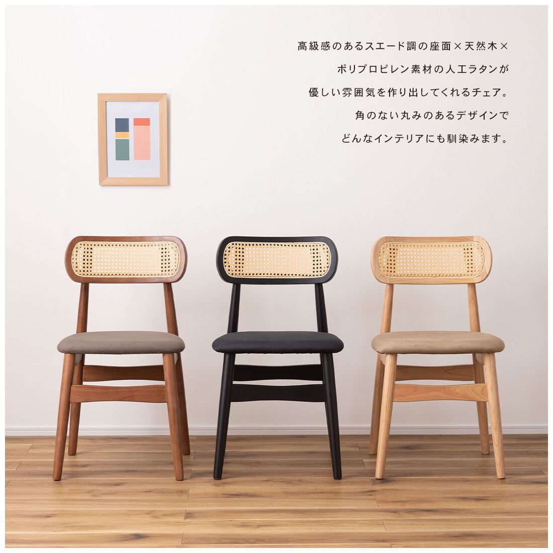 高級感のあるスエード調の座面×天然木×ポリプロピレン素材の人口ラタンが優しい雰囲気を作り出してくれるチェア。